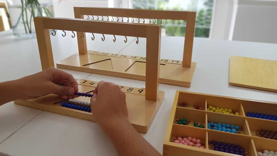 Materiały Montessorii- z zakresu sensoryki, liczenia do 9, poznawania systemu dziesiętnego, dodawania i odejmowania dużych liczb, mnożenia, dzielenia, geometrii itp.